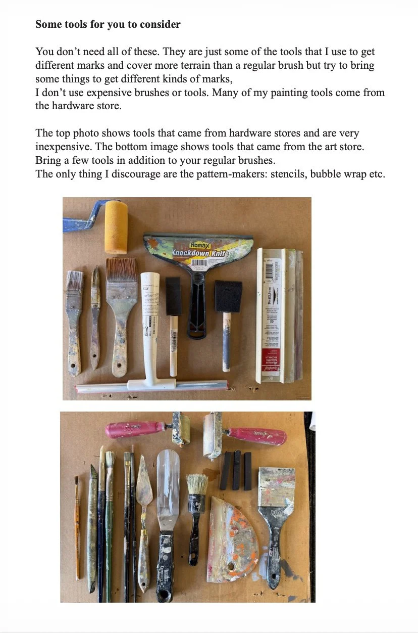• Bring the painting surface you prefer: 8 20x20-ish, 1 or 2 larger up to 36” for last day (get the inexpensive stuff)